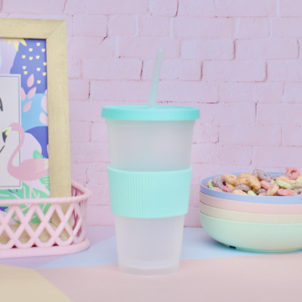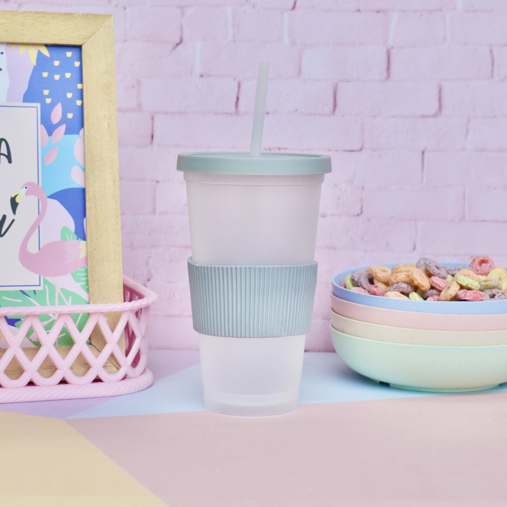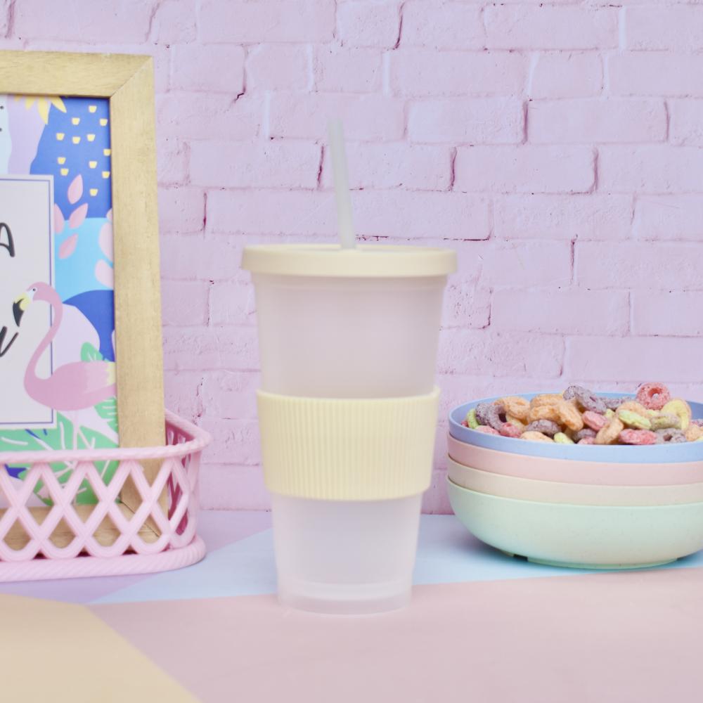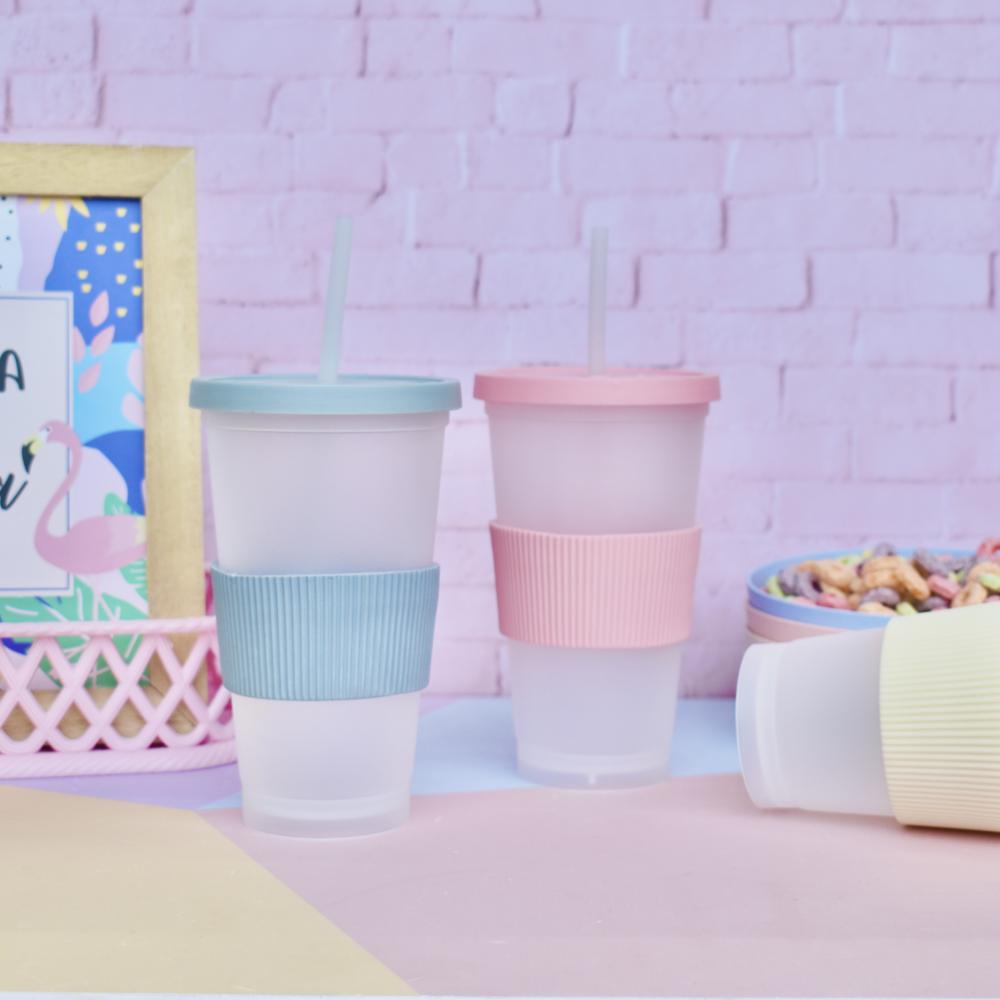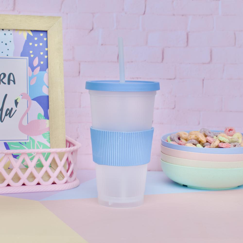 Perfecto para tu bebida preferida! Vaso plástico traslucido con tapa a presión mas banda de silicona y sorbete! Capacidad: 450cc Alto: 16cm Diámetro: 5,5cm