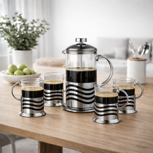 2J- SET CAFETERA CON 4 TAZAS BASE DE ACERO